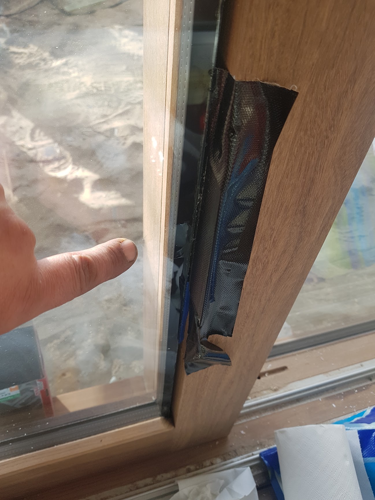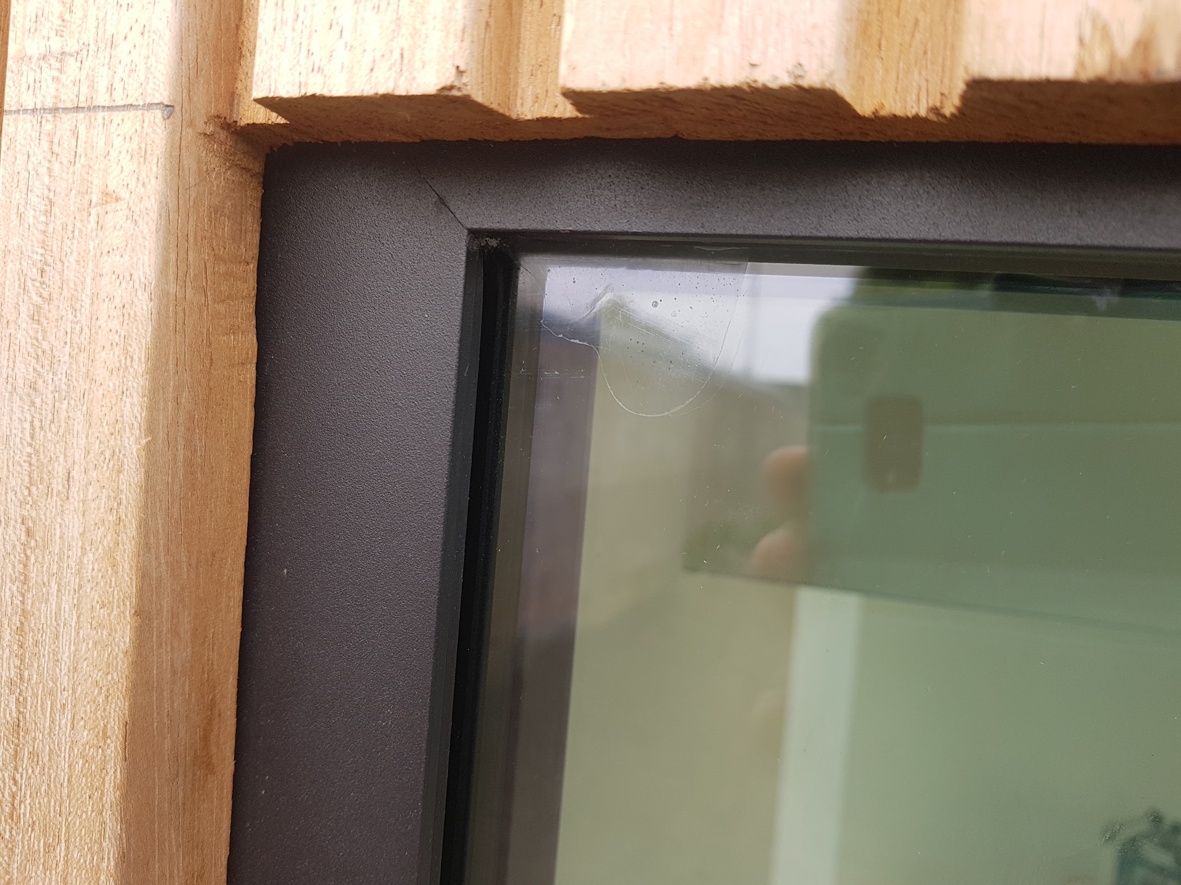 Grote herstelling op hoogte, links in bovenhoek van de ruit...